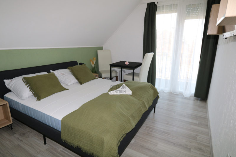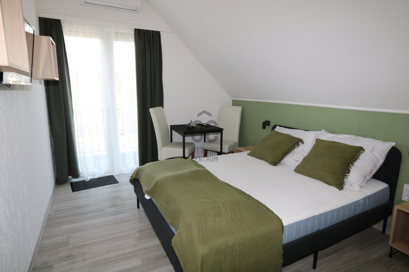 Az ingatlan, amely jelenleg panzióként üzemel, 395 nm hasznos alapterületű, és egy 1022 négyzetméteres telken helyezkedik el. A terasz mérete 40 négyzetméter, míg a tetőtéri erkélyek 37,76 és 11,40 nm-esek, így elegendő helyet biztosít vendégei számára, a pihenésre és a kikapcsolódásra. Az ingatlan tökéletesen jó állapotban van, fűtése két, egymástól független gáz cirkó rendszerrel megoldott, valamint 14 db első sorban hűtésorientált klíma került felszerelésre, melyek fűtésre is alkalmasak. A földszinten 3 méteres a belmagasság, a tetőtérben 2,8 méteres. Az ingatlan kívülről 10 cm-es EPS és 5 cm-es XPS szigetelést és nemesvakolatot kapott. A magastető héjazata betoncserép, a műanyag hőszigetelt nyílászárók redőnyökkel vannak felszerelve. A kertben egy 9x4 méteres 1,5 méter mély gépesített medence tvan. Az ingatlan területén ásott kút és egy bruttó 60 nm-es melléképület található. Utóbbi korszerűsítése után akár reggeliztetésre, vagy welness központ kialakítására is alkalmas, kialakítható benne például szauna, jakuzzi, pilates, stb.