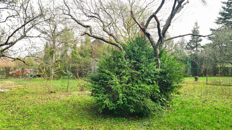 A telek kb. 20 × 40 méteres, viszonylag sík, enyhén lejtős, jól kihasználható formájú és méretű.