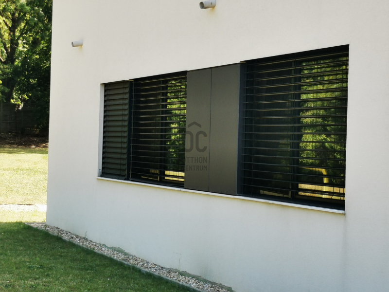 A homlokzati nyílászárók REHAU GENEO PHZ mindkét oldalon fóliázott műanyag nyílászárók 3 rétegű üvegezéssel, redőnyökkel és elektromos működtetésű Alumark zsaluziával, távirányítós Becker vezérléssel.