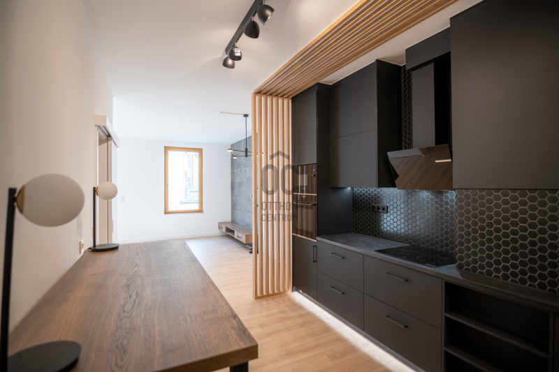 Világos nappali a lakás központi tere, amelyhez egy beépített, prémium minőségű gépesített konyha kapcsolódik, így a mindennapi élet és a vendégek fogadása is kényelmesen megoldható.