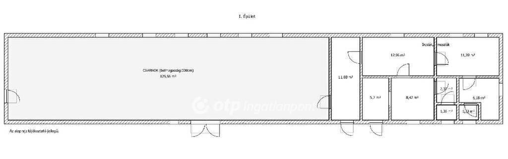 Az 1.sz. épület vasbeton szerkezetű, tégla kitöltéssel, cserép fedéssel. Magában foglal egy 125m2-es csarnokot, valamint 60m2 fűtött kiszolgáló egységet (irodák, mosdók). Ebbe az épületbe be van vezetve a víz, gáz, áram (3x50A).