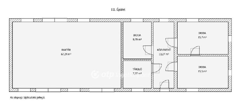 A 3.sz. épület tégla falazatú. Alkalmas lehet raktár (67m2) és iroda (61m2) funkciónak, erősen felújítandó állapotban van.