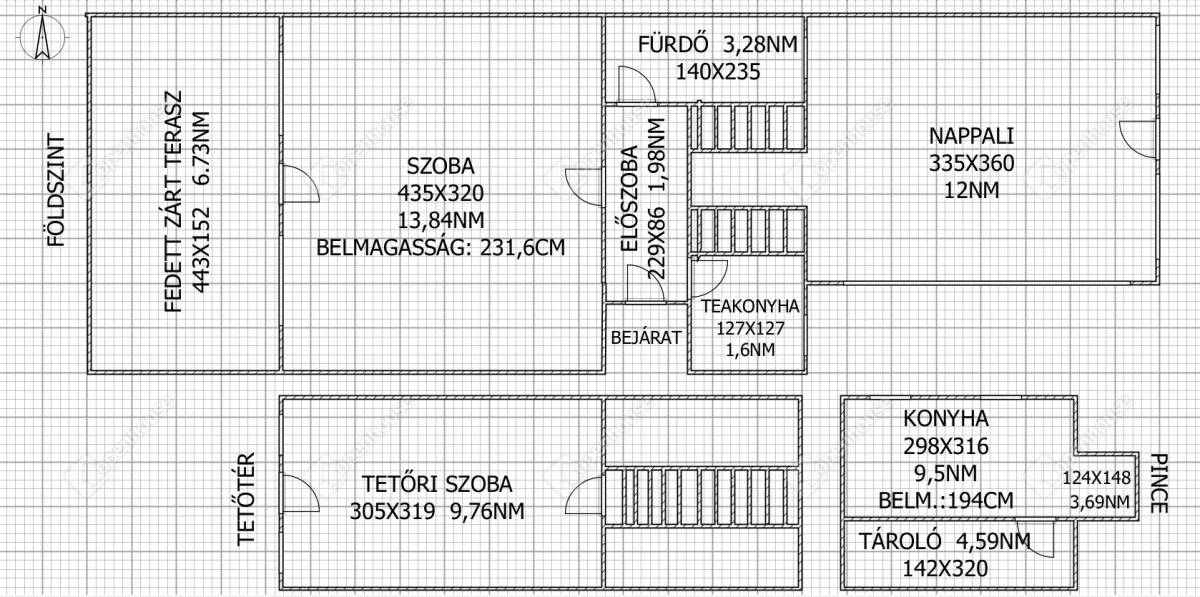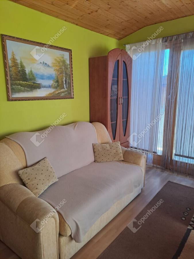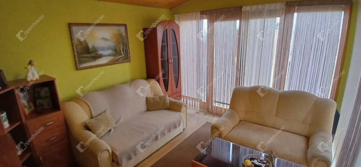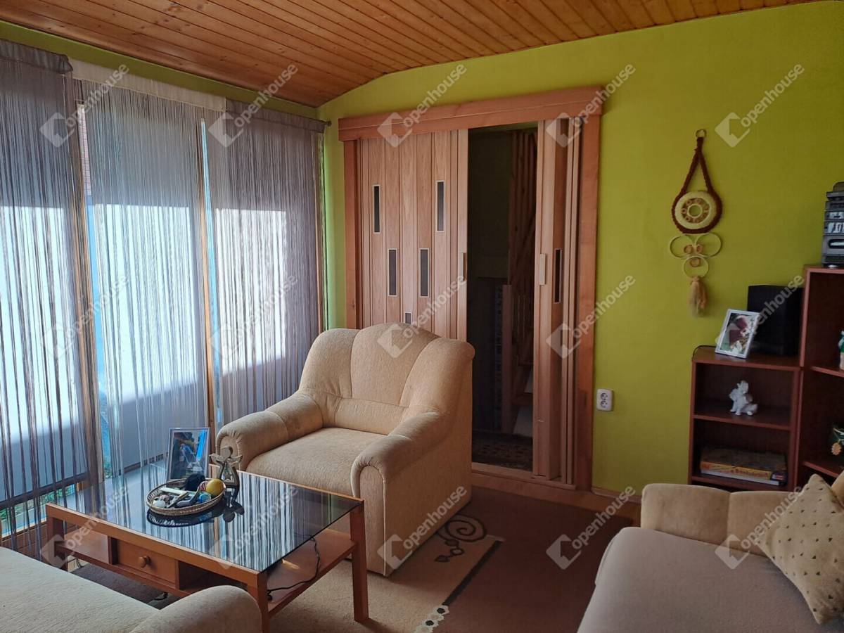Az ingatlan belső elrendezése praktikus és jól átgondolt. Az alsó szinten egy szoba, egy tágas, egy légtérben kialakított nappali–étkező, főzőfülke, lépcsőház, valamint fürdőszoba WC-vel található. A lépcsőn keresztül megközelíthető az emelet, ahol egy különálló szoba kapott helyet, illetve innen lehet lejárni a pincébe is, ahol egy konyha és egy tároló helyiség található.