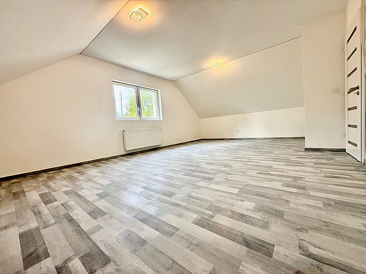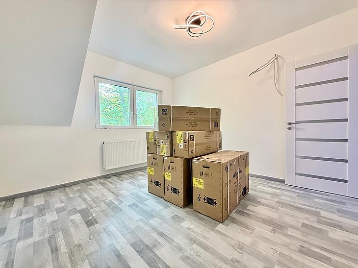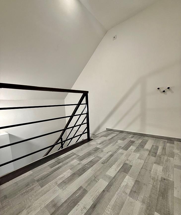 Az emeleten amerikaikonyhás nappali, 2 szoba, fürdő és egy gardrób istalálható.