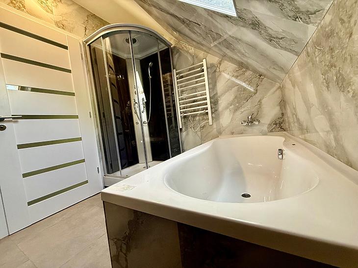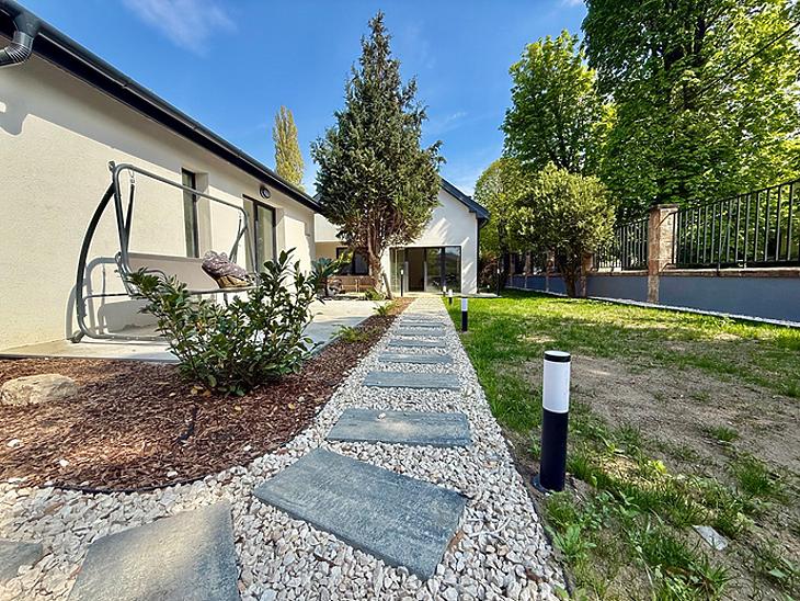 Tartozik a házhoz fedett kocsibeálló, Jacuzzi és kombinált finn szauna, valamint a napelemes rendszer és elektromos autó töltő rendszer előkészítése is megtörtént.