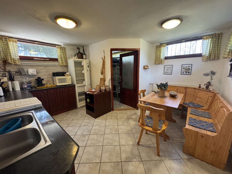 Szuterén szint: A terasz alatt egy tágas, teljesen felszerelt konyha-étkező és egy praktikus kamra kapott helyet.