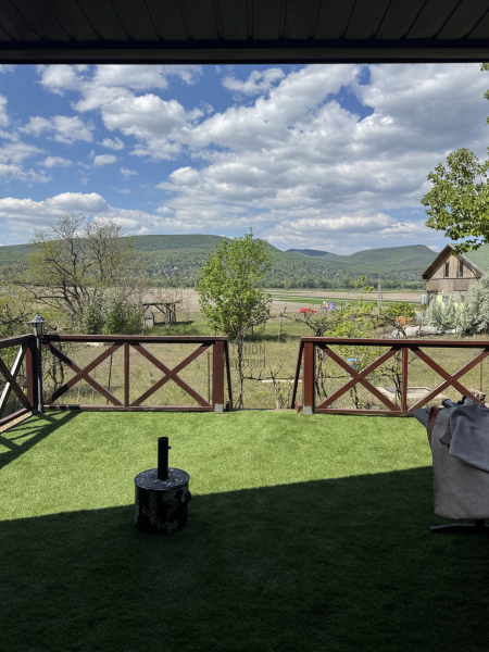 Lenyűgöző panoráma: A közel 20 nm-es teraszról zavartalan kilátás nyílik a Pilis vonulataira – tökéletes helyszín a reggeli kávéhoz.