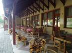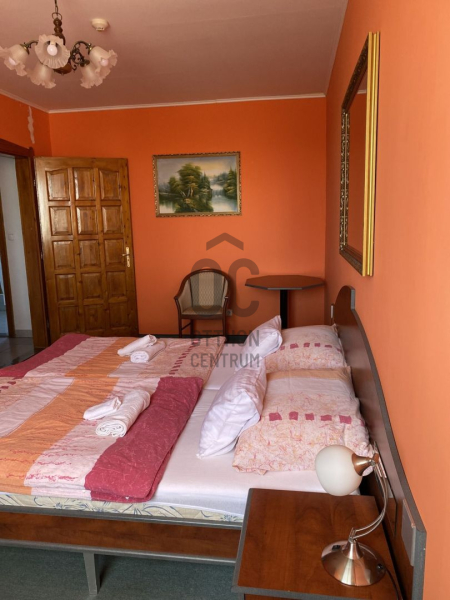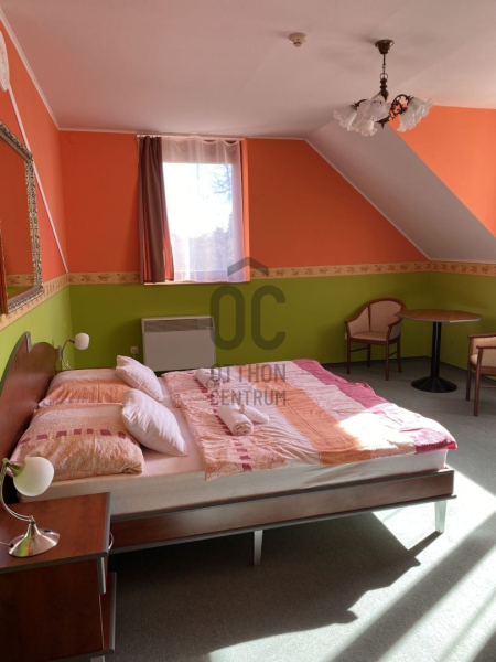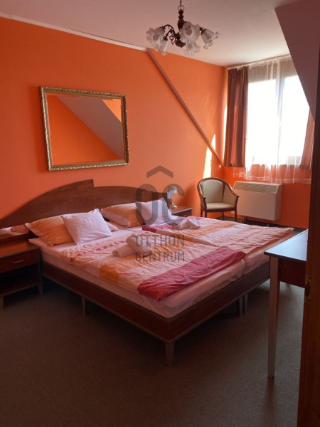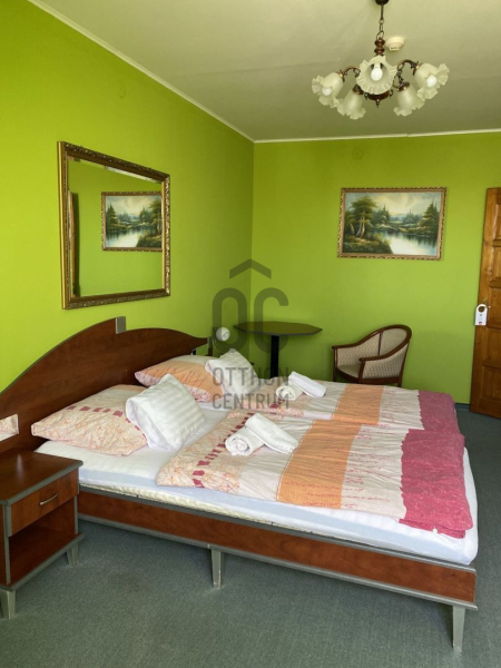 A telken elhelyezkedő főépület egy 2000-ben épült, földszint + tetőtér + galéria kialakítású, nettó ~1430 m² alapterületű szálloda és étterem. Az épület hagyományos szerkezetű: tégla teherhordó falazat, vasbeton födém, fa fedélszék és zsindely héjazat jellemzi. Műszaki állapota összességében jó, szerkezetileg stabil. Az ingatlan teljes közműellátottsággal rendelkezik (víz, villany, gáz, csatorna), fűtését központi gázkazán biztosítja, emellett klimatizált helyiségek, valamint kiépített riasztó- és kamerarendszer növeli a komfortot és a biztonságot.