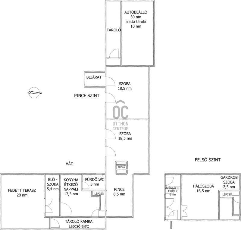 Két tárolóban lehet elhelyezni a kerti dolgokat, és két kocsinak van kialakítva autóbeálló.