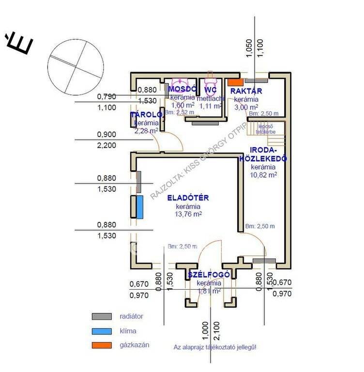 Helyiségek: eladótér (13,76m2), szélfogó, közlekedő-iroda, raktár, WC, mosdó, tároló (össz.: 34,38 m2).