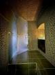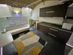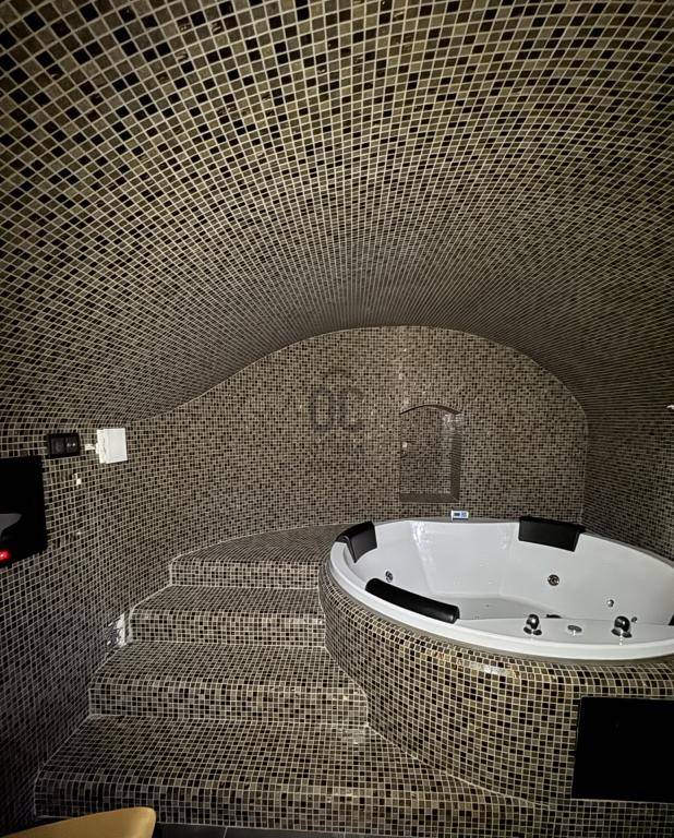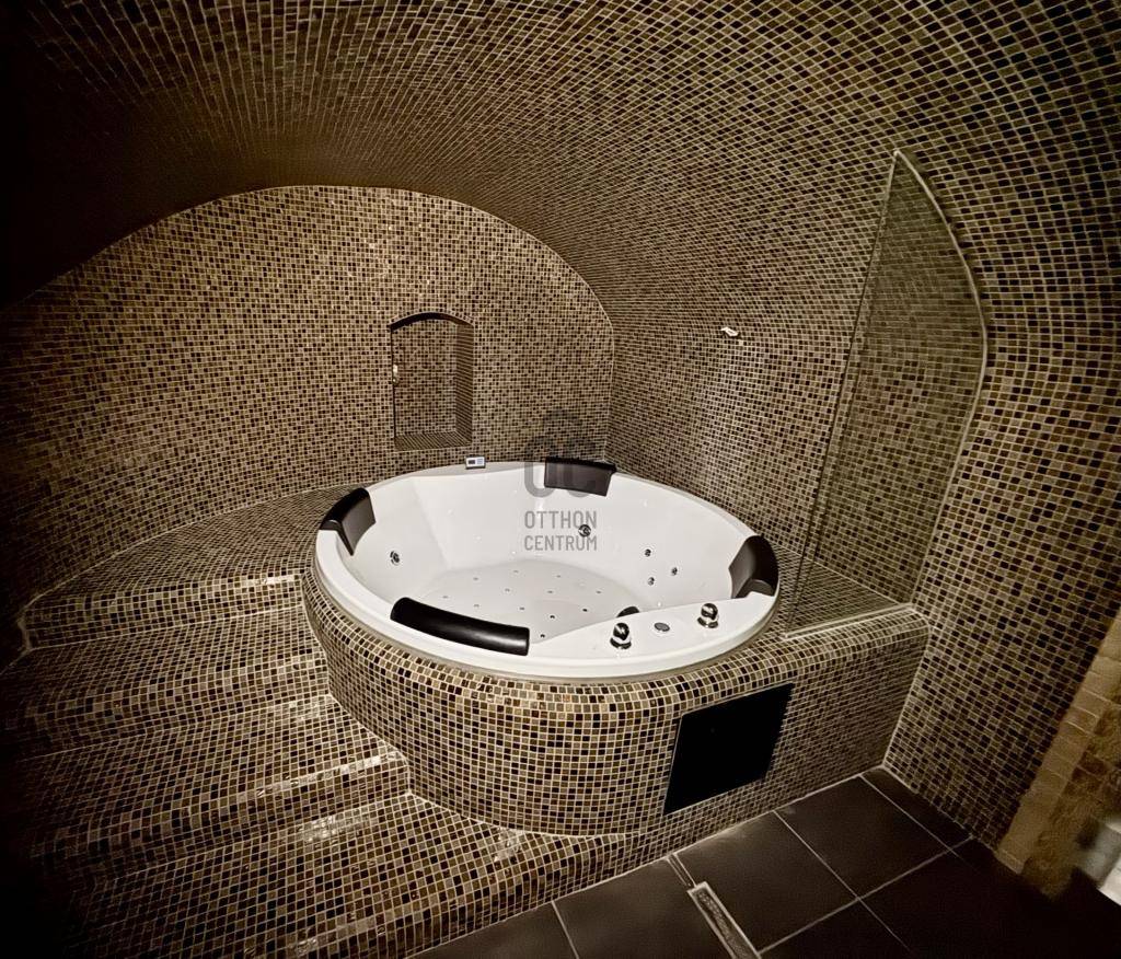 A vizesblokk másik oldalán egy üvegajtóval elválasztott zuhany és masszázsmedence van beépítve, a falban vízálló TV-vel.