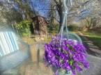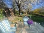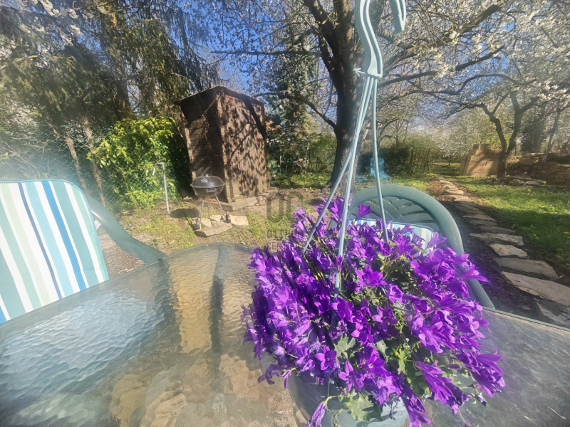 A kert igazi kis oázis: cseresznye, körte, dió és meggyfák, füves pihenőrész és saját veteményes is helyet kapott.
