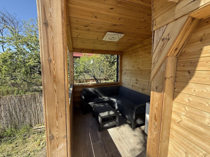 A ház előtt és mögött is teraszos kialakítás található, így mindig megtalálhatja a napsütéses vagy árnyékos pihenőhelyet. A telek végében egy praktikus tároló is helyet kapott.